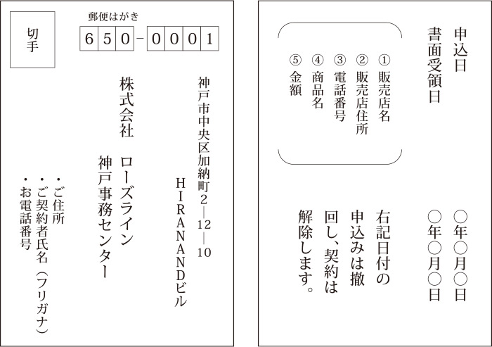 - お客様が、訪問販売でご契約された場合、本書面を受領された日から8日を経過するまでは、書面(下図参照)又は電磁的記録(電子メール等)により無条件で契約の解除を行うこと(以下「クーリングオフ」といいます。)ができ、その効力は書面又は電磁的記録による通知を発信したとき(郵便消印日付など)から発生します。だだし、現金取引(契約したその場で商品の引渡しを受け、あるいは役務の提供を受け、かつ代金の全部を支払うこと)で、その金額が3千円未満のときは、クーリングオフはできません。